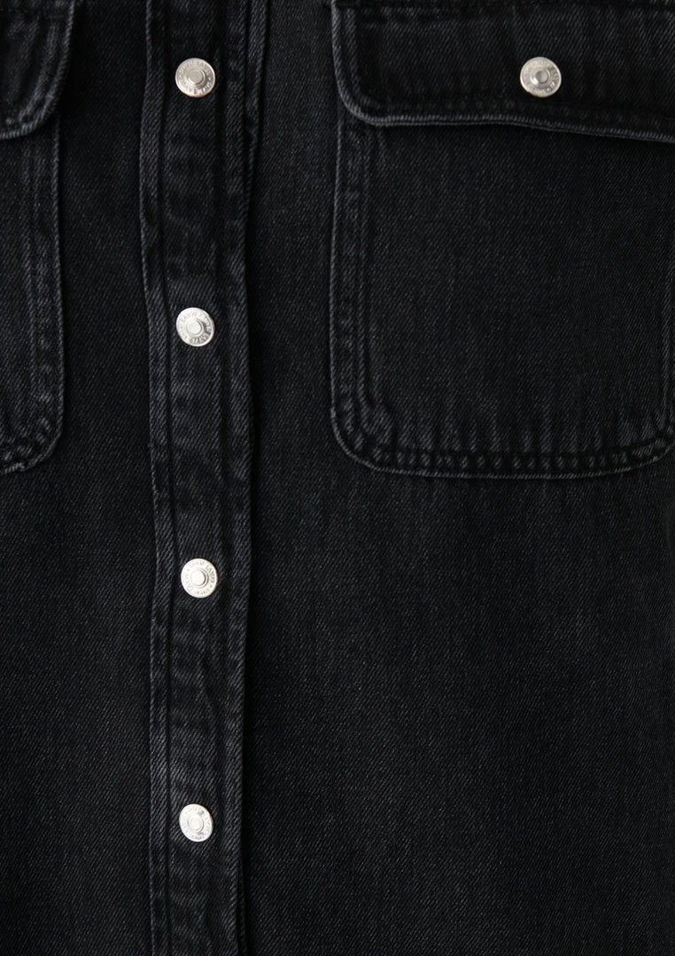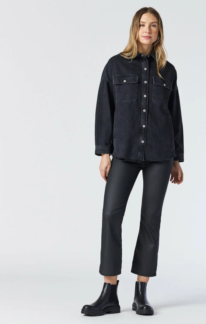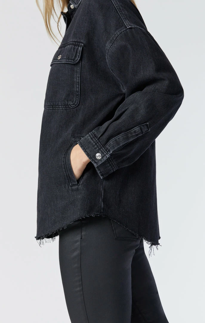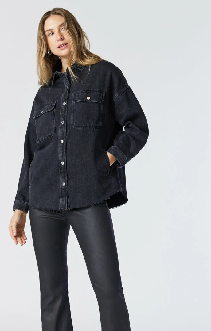 This edgy oversized denim shirt is finished in a smoky wash and raw hem that give this retro style a modern update that looks just-right during the day and easily dresses up for nights out.