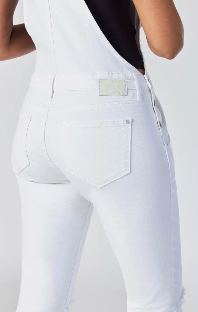 A denim overall that bridges old-school cool and modern flair, this bright white style has the rips and details of a vintage classic with the color and streamlined fit of a chic new addition.