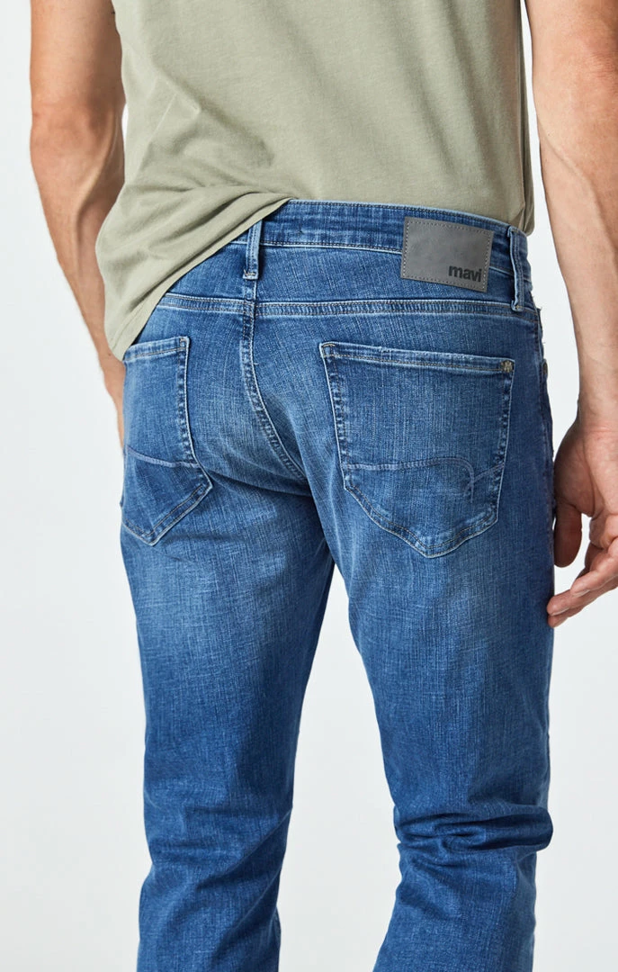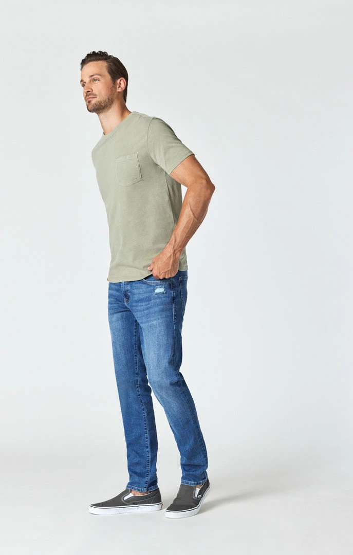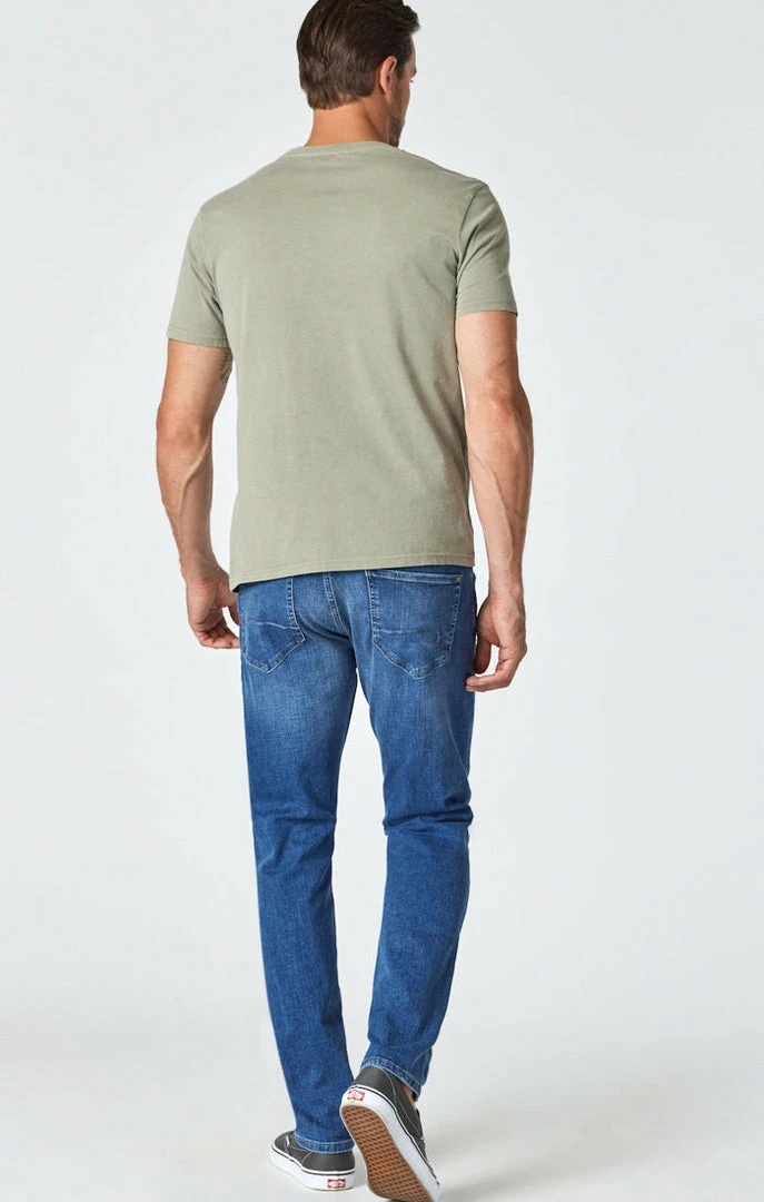The look of an old favorite, the fit and fabrication of a modern jean. This slim-leg pair is designed with an organic cotton fabrication that has maximum stretch and softness while maintaining the appearance of authentic, heavily washed denim.ย