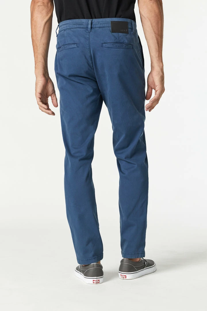 These athletic fit chino pants are the perfect choice for those seeking a tapered leg and roomy thigh. Durable stretchy twill in a blue hue is finely brushed for a super soft hand feel.