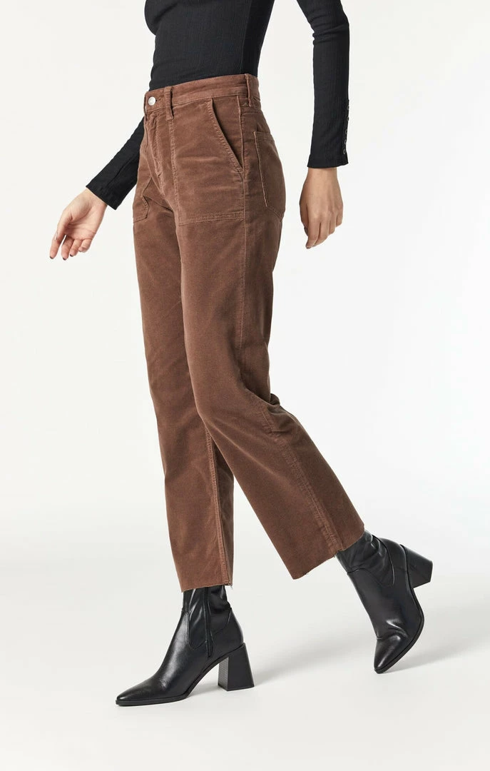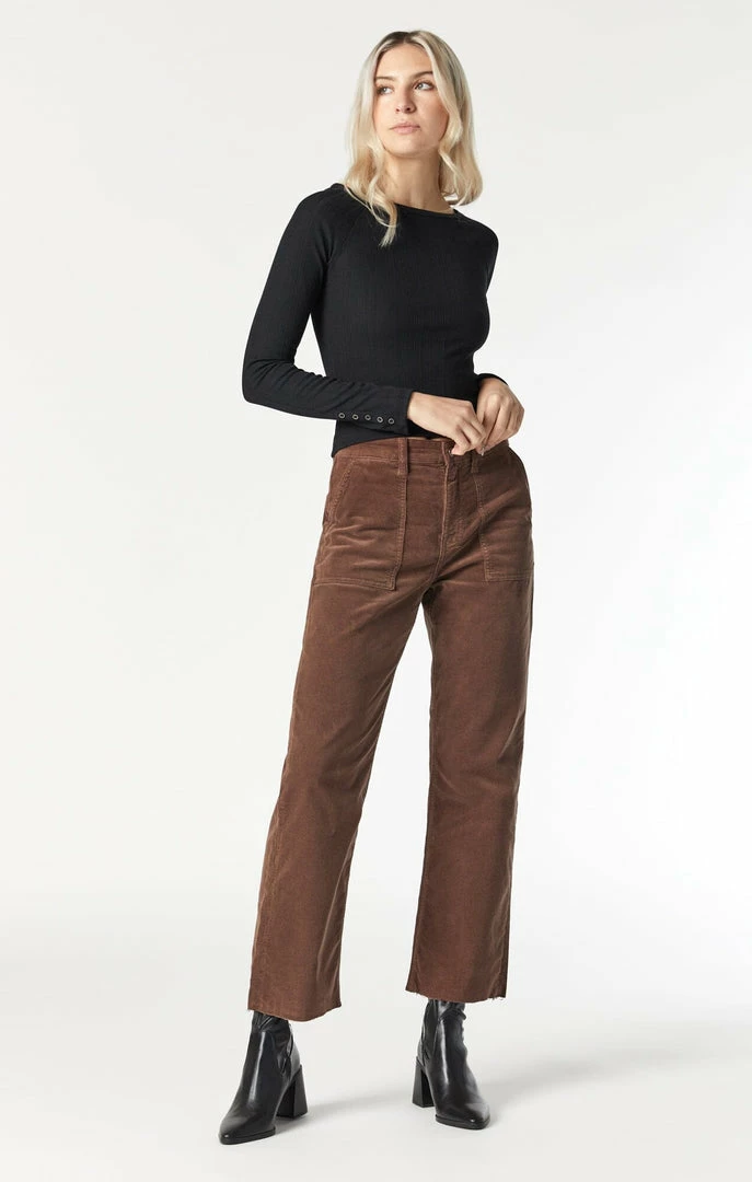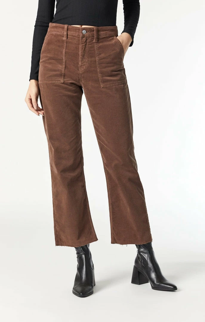 Meant for wearing anywhere while maintaining all-day comfort, these straight-leg cropped cords in a chocolate brown hue take a classic fall style to the next level with more flexibility, softness, and elegance.
