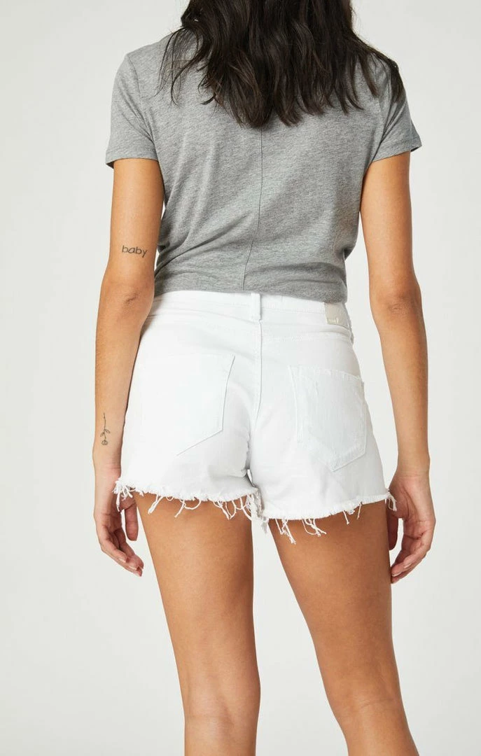 These perfectly roomy, stretchy denim shorts are designed in a brilliant white wash for a style that dazzles, with a fringed hem that adds a touch of edge.