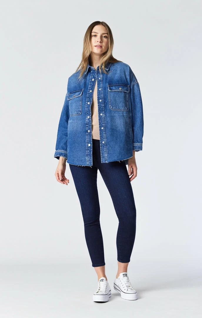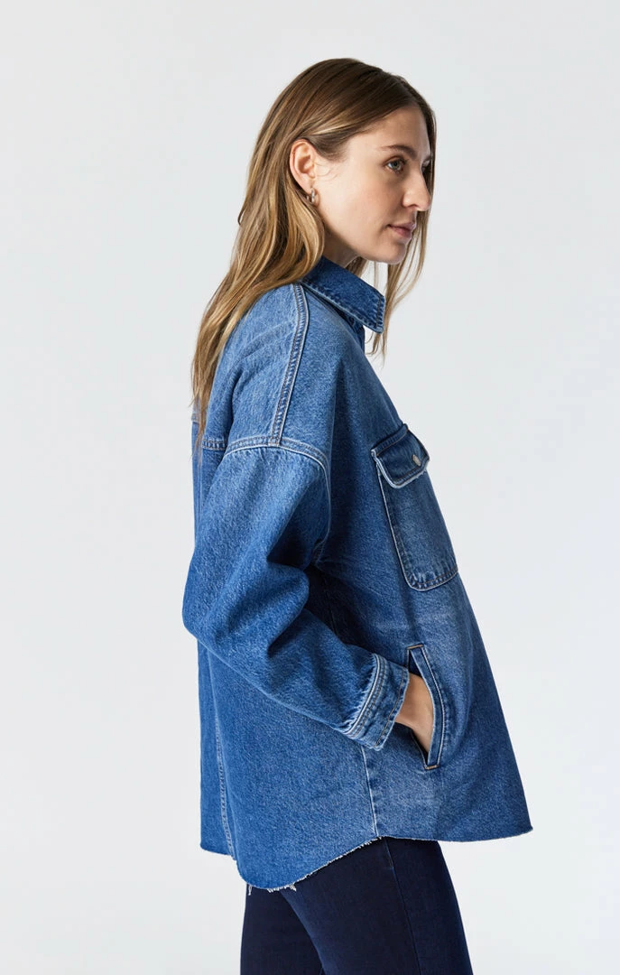 Oversized yet never slouchy, this effortless denim shirt doubles as an edgy jacket. Itβs designed with the raw hem and heavy distressing of an old favorite, but has an entirely modern cotton fabrication.